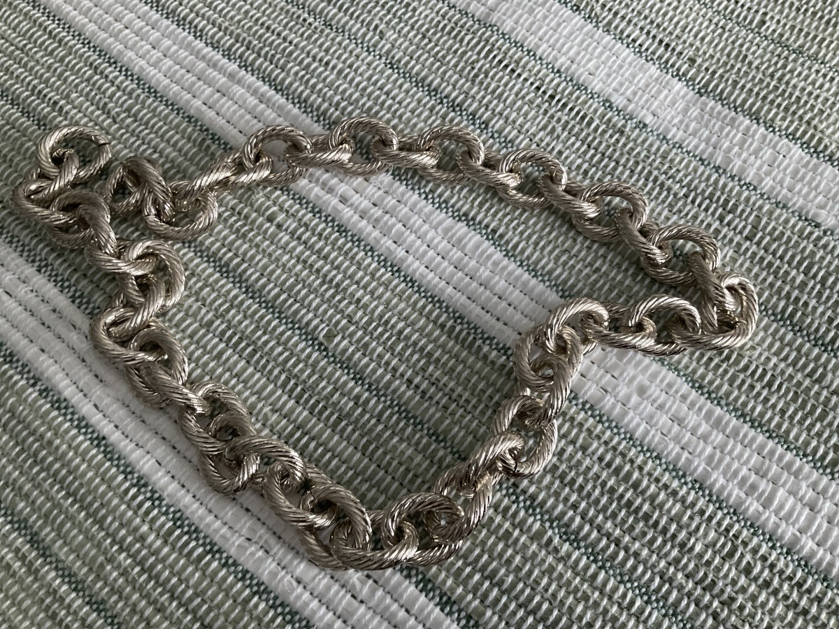 Aluminium chain, with a striated cable mesh, covered with a rhodium-plated finish.
