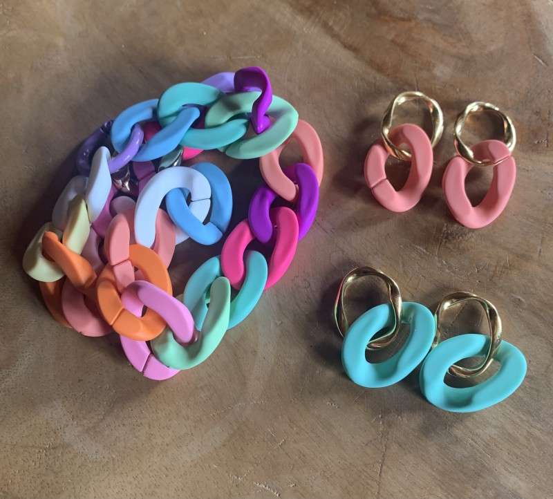 Opaque multicolored matte, twisted and detachable links are made of acrylic. They are essential for making accessories and XXL costume jewelry.