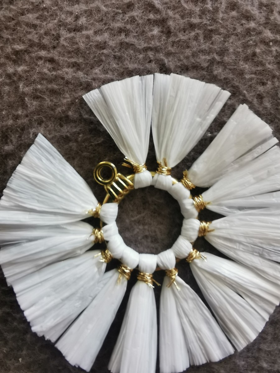 This pendant is made of a gold finish ring on which are hung the tassels made of natural raffia, giving a very trendy effect.