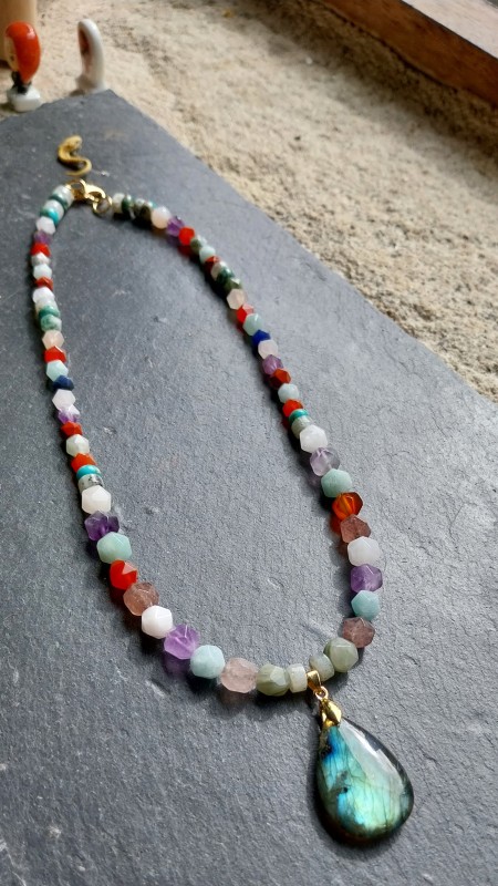 Hexagonal bead thread made of different gemstones (amethyst, amazonite, sodalite, carnelian, red jasper, rose quartz, red agate, dyed agate, moss agate...).