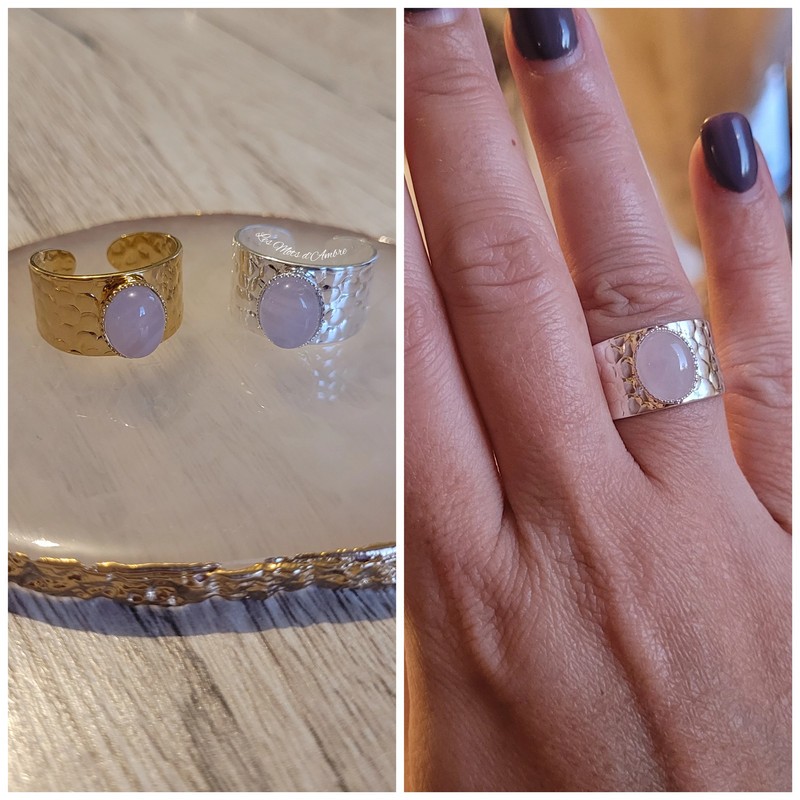 Its wide hammered ring is not closed so that it can be easily adjusted to your finger.