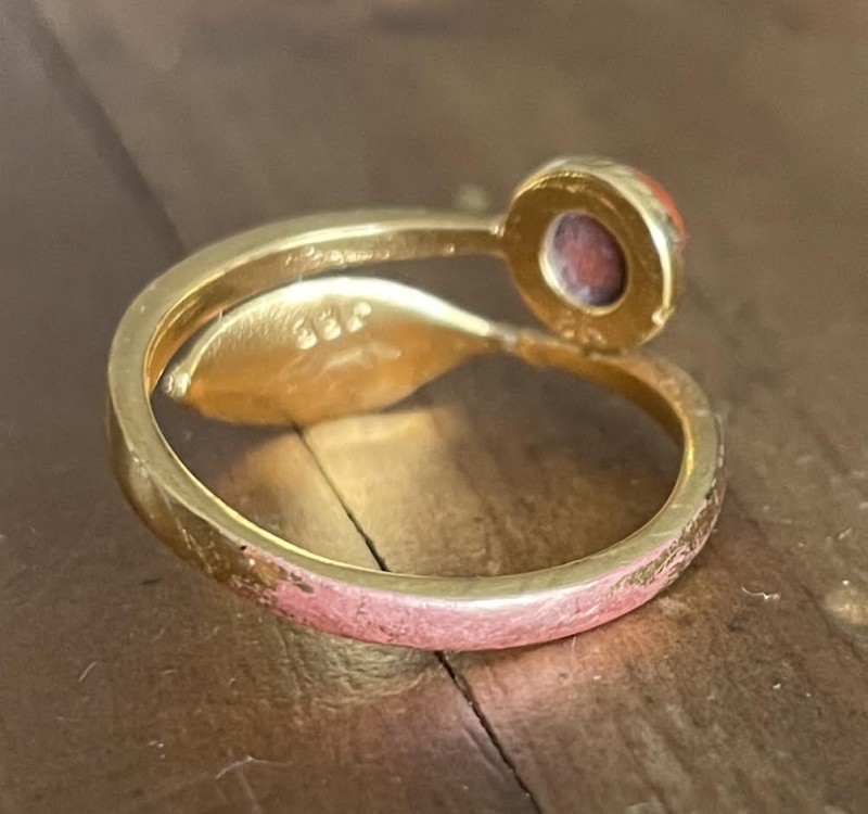 A gold plated jewel is made using a base metal alloy (depending on the object and its strength) for this ring, its brass covered with gold (between 14 and 16 carats) on a layer of 3 microns minimum.