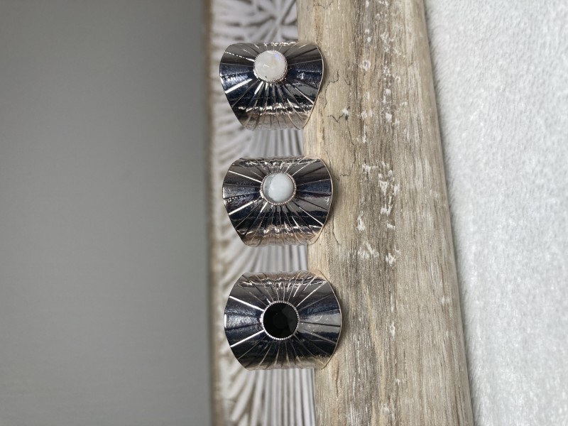 It has a setting in its center that can receive a cabochon or a 6 mm puck.