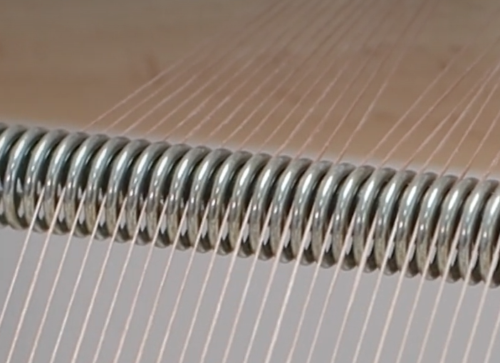 Coupez des fils de 1 m et nouez-les sur un des clous. Deserrez le rondin et tournez-le pour enrouler les fils sur plusieurs tours. Placez les fils dans le ressort et nouez-les de l'autre côté. Tendez bien les fils en tournant les rondins. Commencez à tisser du côté non enroulé et une fois au bout du métier à tisser. Deserrez à nouveau les rondins pour enrouler le fil et le tissage sur l'autre rondin. Serrez et continuez à tisser. Cordialement,