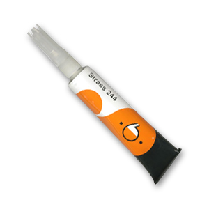 A special, colourless, solvent-based, one-component adhesive for gluing of small glass-, strass- or simili-rhinestones (e.g. PureCrystal) with diameter up to 5 mm to a variety of hard materials like metals, glass, china ...