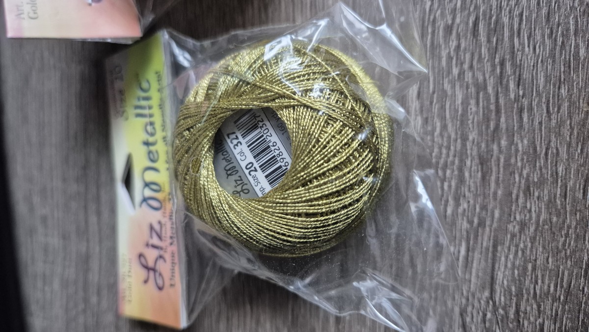 This Liz Metallic 6-strand thread, comparable to size 20 in the Lizbeth range, in Poussière d'or (n°327) color, is made of polyester covered with a metallized polyethylene terephthalate (PET) thread.