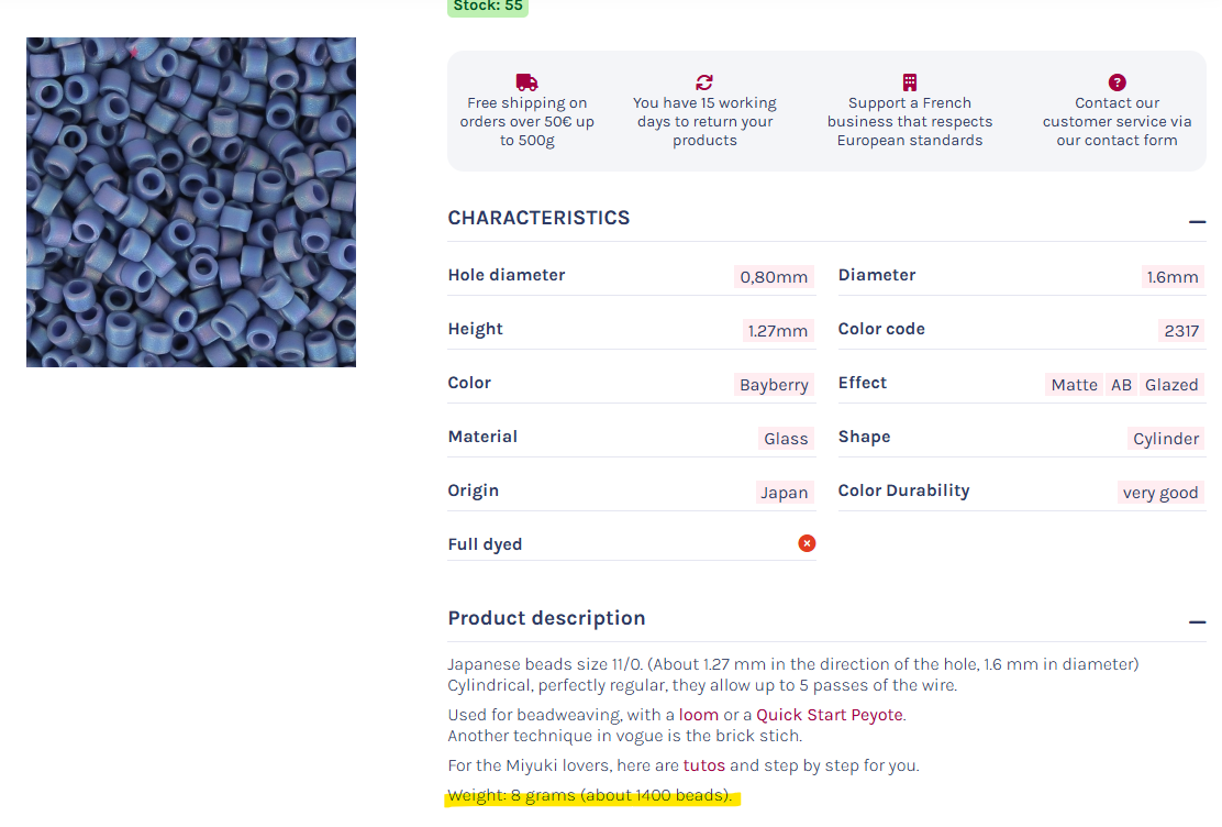 Japanese beads size 11/0. (About 1.27 mm in the direction of the hole, 1.6 mm in diameter)