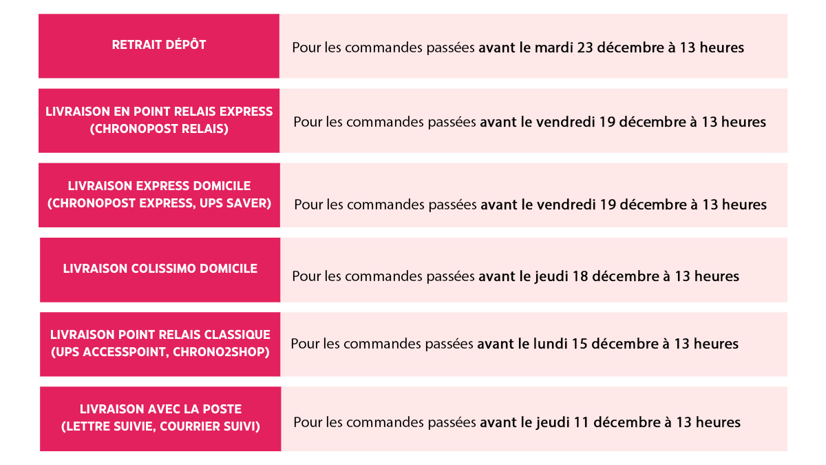 Don't worry! Place your order before the deadline* indicated below for delivery before Christmas.