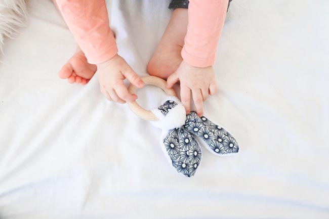 Here's a quick and easy sewing tutorial! Very practical for soothing baby's gums, it's also ideal as a cuddly toy. This fabric bunny rattle has been made with a CE-compliant teething ring, and is made from saliva-resistant, untreated wood.