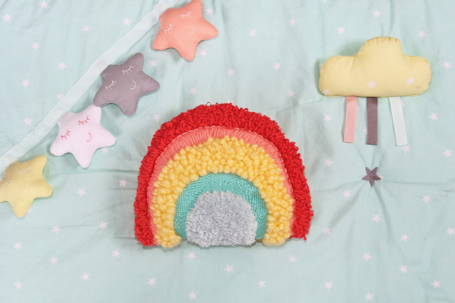 The idea behind this rainbow cushion tutorial is to create a sensory and decorative object that stimulates your baby's sense of sight and touch, by varying the effects and creating different volumes. And what better way to do this than with punch needle! This relief embroidery technique is fun and easy to do (once you get the hang of it). The principle is simple: you stitch on the reverse side of a canvas or fabric, and small curly stitches form on the right side. The punch needle is the decorating must-have of the moment! Check out our other DIY punch needle tutorials.