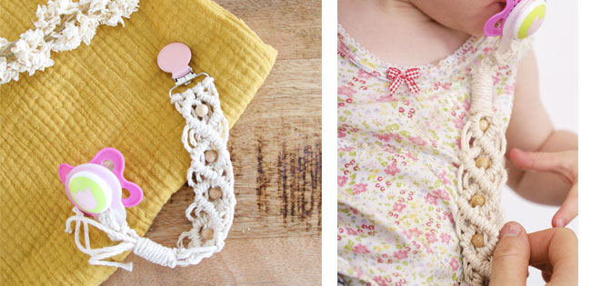 We love macramé, so we thought combining the two could only look good! Easy to make, you'll love this prettymacramé pacifier clip twisted with wooden beads.