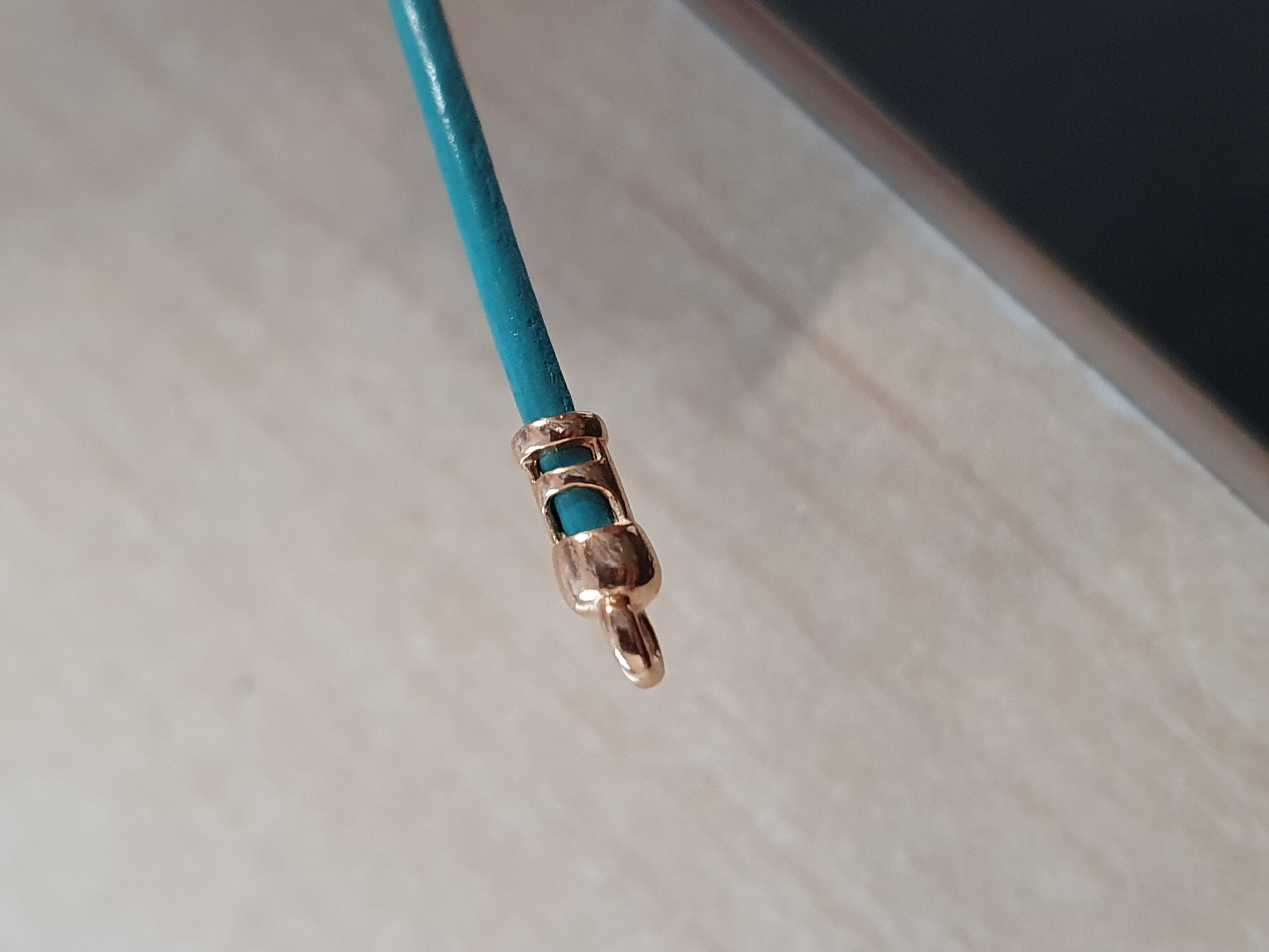 Secure the cord with hasufix-type glue and put a jumpring open in the hole for a better finish.