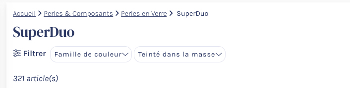 Bonjour, je vous joins une photo pour vous montrer où se trouve le filtre "teintée dans la masse". Dans la catégorie SuperDuo, il est situé en haut, à côté du filtre famille de couleur. Pour chaque fiche produit, le filtre est bien renseigné, et vous pouvez également retrouver l’information dans les caractéristiques si besoin.