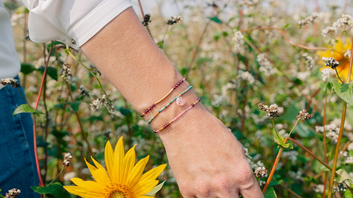 The jewelry in the "L'Été Indien" collection includes delicate necklaces, fine bracelets and creoles embellished with charms and natural stone beads. The stones used vary in shades of green, pink, garnet and turquoise, recalling the colors of nature.