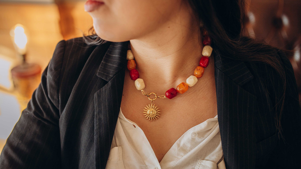 The colors of the collection are warm and reminiscent of the seventies: khaki, terracotta and dark red. These earthy hues are also very trendy this year. In fact, the color of the year 2025 is Mocha Mousse, according to color specialist Pantone. It's a set of soft, brown hues. These comforting colors harmonize perfectly with professional outfits such as blouses and blazers. For the more daring, an extravagant necklace tutorial mixes different bead shapes and brighter colors for an original, arty look.