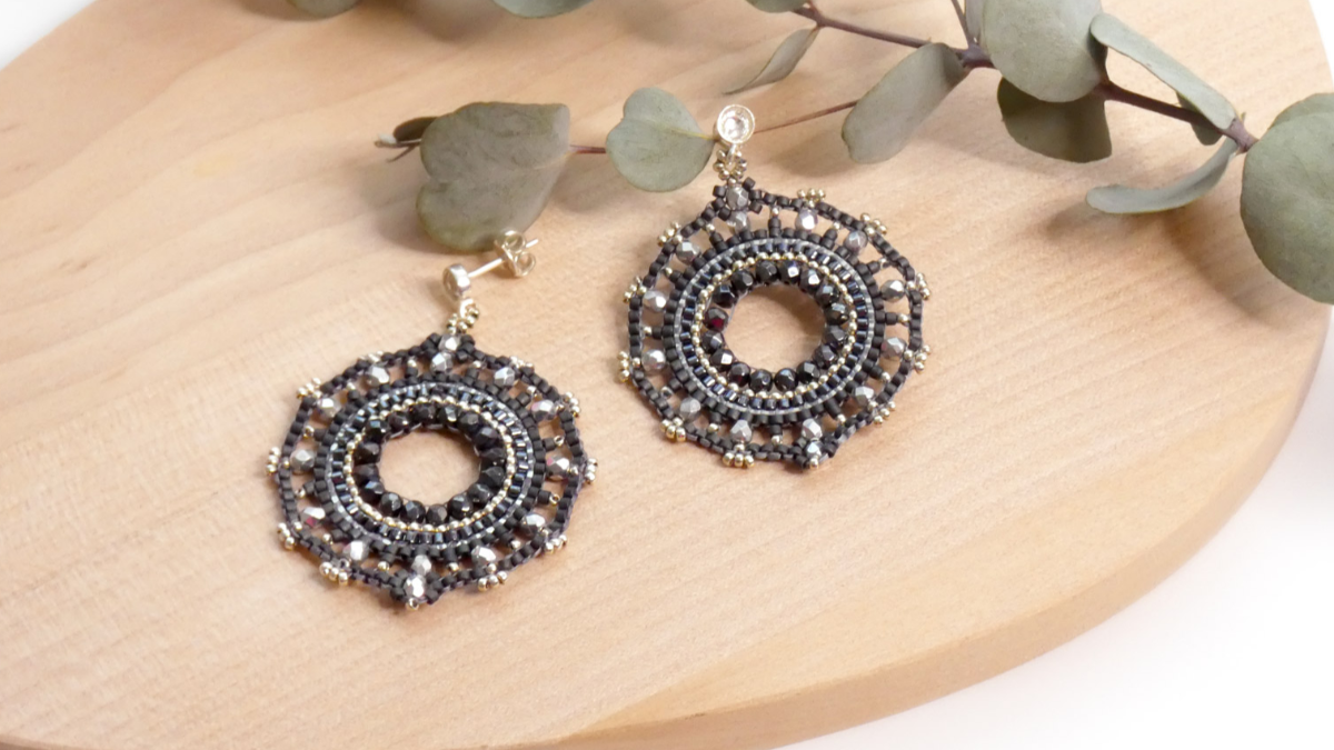 The first part of the weave is rather simple if you already know the brick stitch weave around a ring. It consists of making 3 rows of beads of different shapes and sizes. The number of beads here is not important except for the last row of bohemian facets. You have to fix 16 of them evenly distributed all around the circle on the two loops.