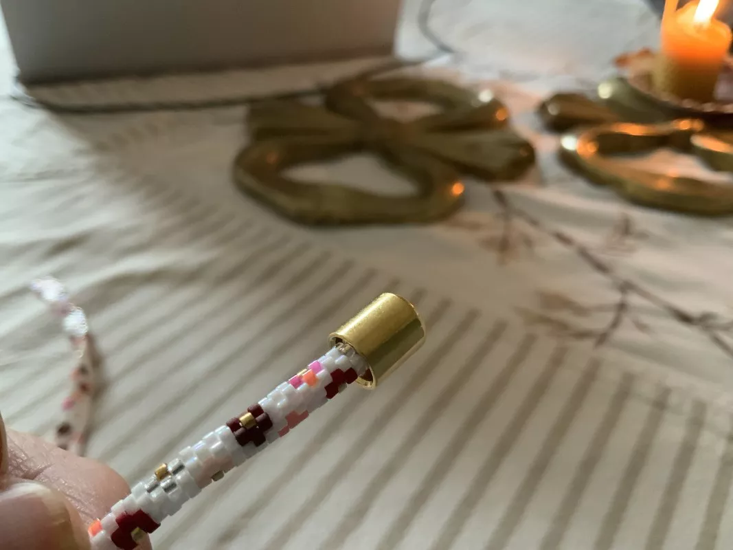 I strongly advise you to put a stop bead. To do this, thread a bead (a color not present in your weaving, so as not to confuse it) and iron it in. We will remove it once the weaving is finished.