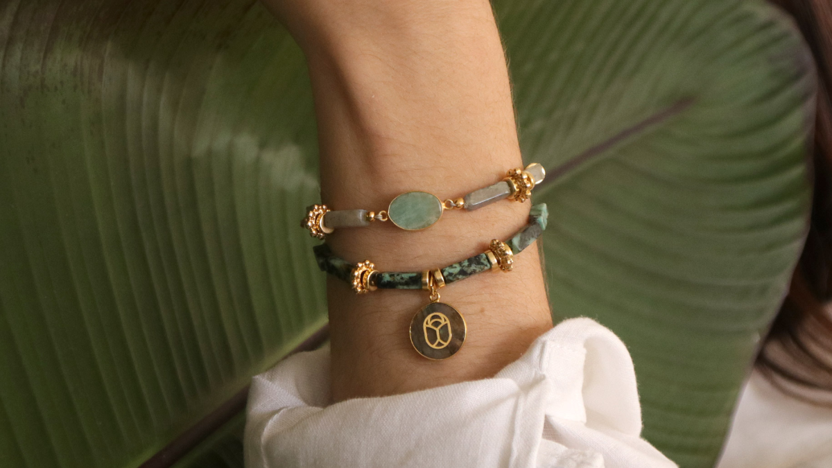 Prepare the two-component glue by mixing the two parts in equal parts. With a toothpick, apply the glue to the beetle and then place the beetle on the pendant. Wait 24 hours before touching it. Cut 50 cm of wire and thread the beads together. If your wrist is longer than 15 cm, add a rectangle bead on each side.