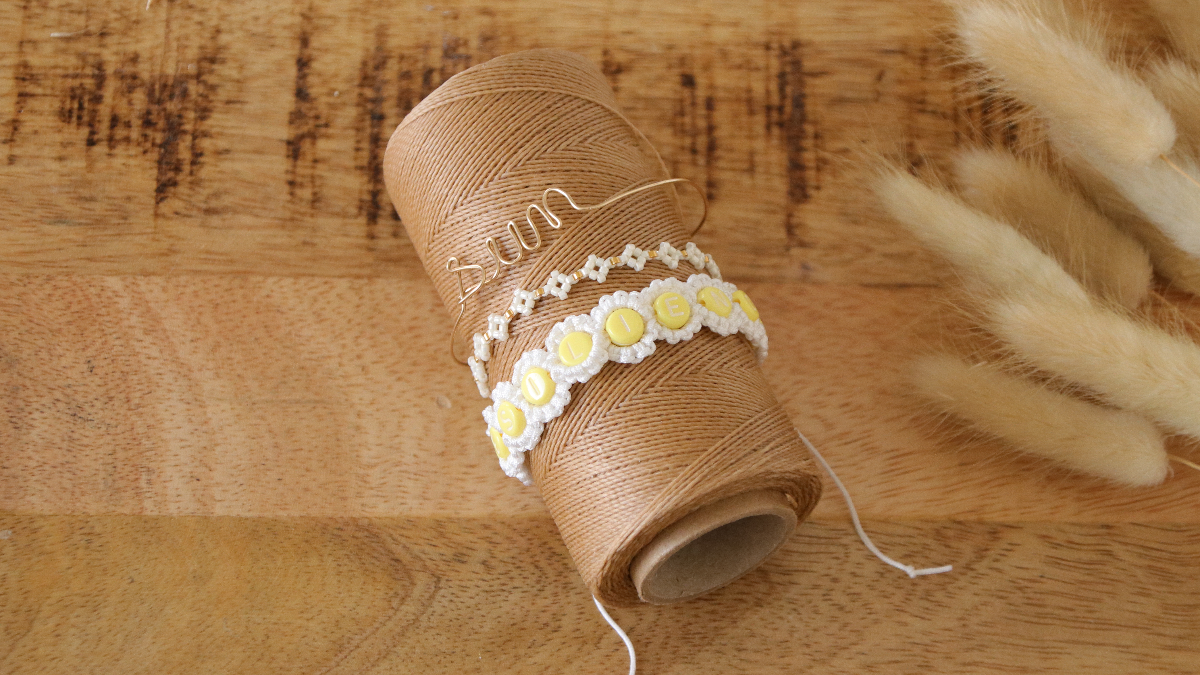 Today we suggest you mix three trends of the summer! Flower bracelets, macramé and letter beads