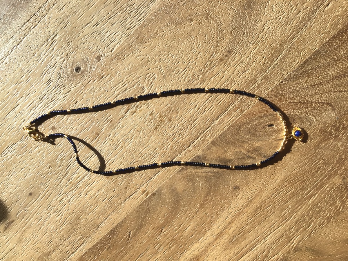 For the small necklace, cut a 50 cm thread. If you have a wide neck, use more thread. Test it around your neck before cutting it. You need 15 cm more for the finishing. Thread 1 crush bead, 1 wire guard, pass the closed ring and pass the wire back through the crush bead.