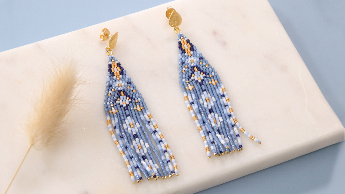 The earring is divided into two parts: The weaving in double Brick Stitch corresponding to the triangle and the beaded bangs. The tension of the thread is very important for this second part. We will see at the end of the video. Know that if your bangs are a little twisted at the end, you can pass them under hot water, smooth them with your fingers and then hang them to dry straight.