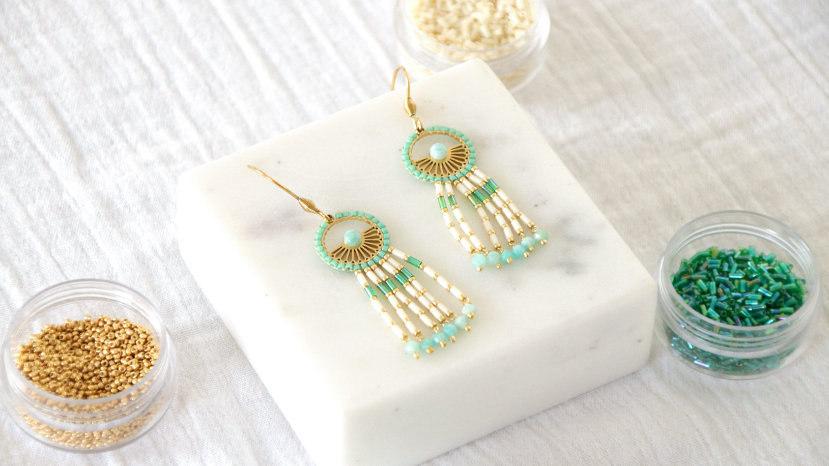 Cut 1 m of weaving yarn and tie it to the pendant near the fastener. Keep 10 cm of the thread end. Thread the longest piece of yarn onto the needle. Thread two turquoise beads and place them against the knot and against the pendant but towards the outside of the pendant. Pass the thread with the needle around the edge of the pendant and back through the second bead, paying attention to the direction. Tighten.