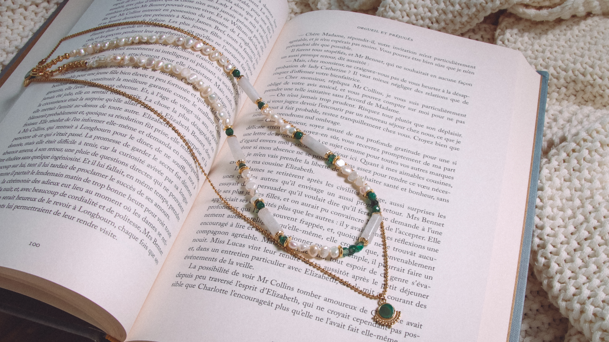 This beginner jewelry tutorial shows you how to make a separate two-row necklace. The first is a necklace with a beaded chain and a pendant. The second necklace is made with gemstone and freshwater pearls. The cabochon and the green beads are made of dyed Agate. Agate is a chalcedony that comes in many varieties and colors. In lithotherapy, it seems that Agate has a calming and anti-stress power. What better way to overcome the stress of the new school year and enjoy a serene fall?