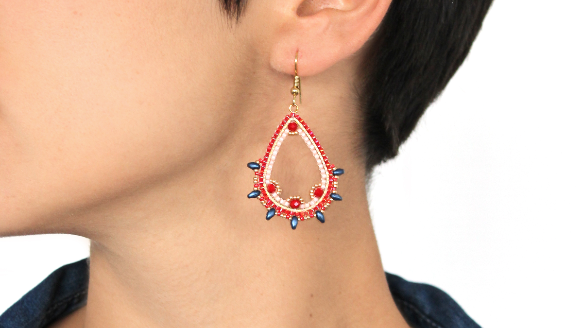 This fancy earring model was originally featured in a former miyuki weaving kit named cherry blossom and presented in 2018 as a limited edition. It's no longer available for sale, but we've decided to offer it again for those who may have missed out. We chose to make these earrings with pep's and vitamin colors (red, blue) and pastel colors (Light salmon), a combination of hues ideal for summer. But there's nothing to stop you imagining the perfect color combination by selecting your favorite pearls from our wide selection of Miyuki and MiniDuo pearls.