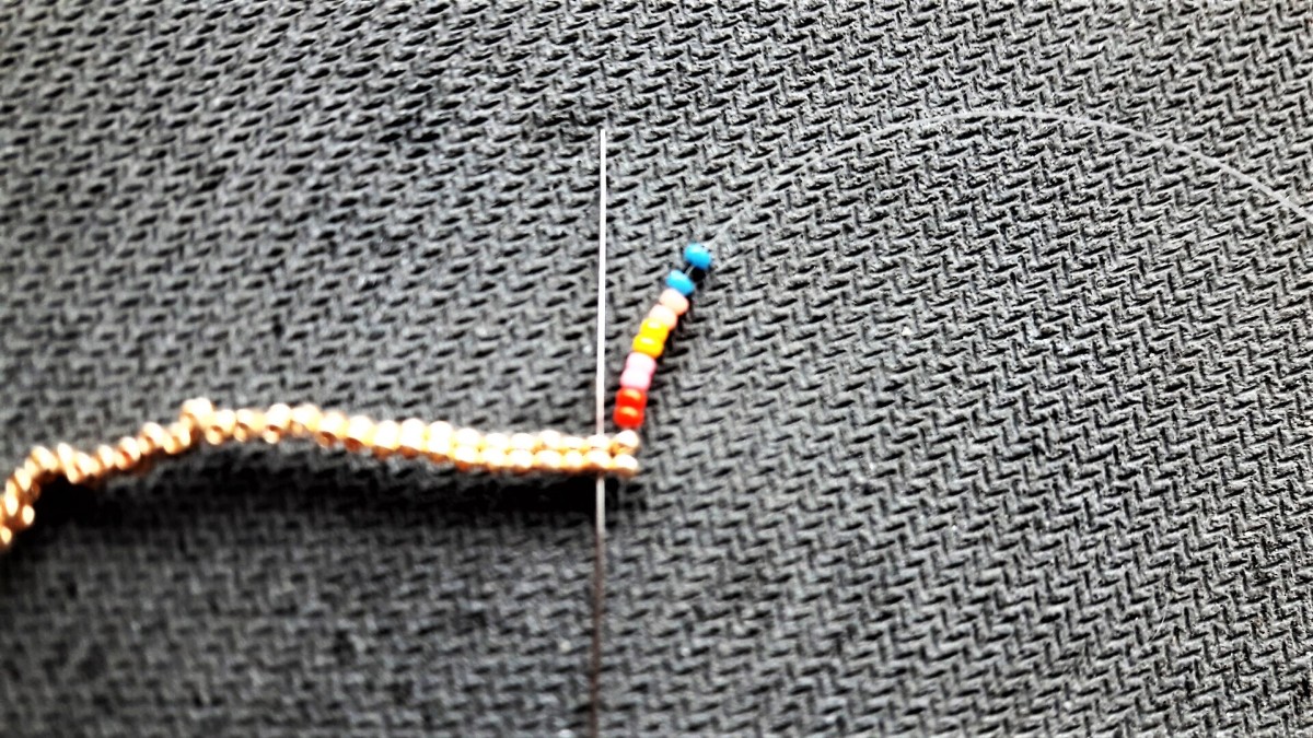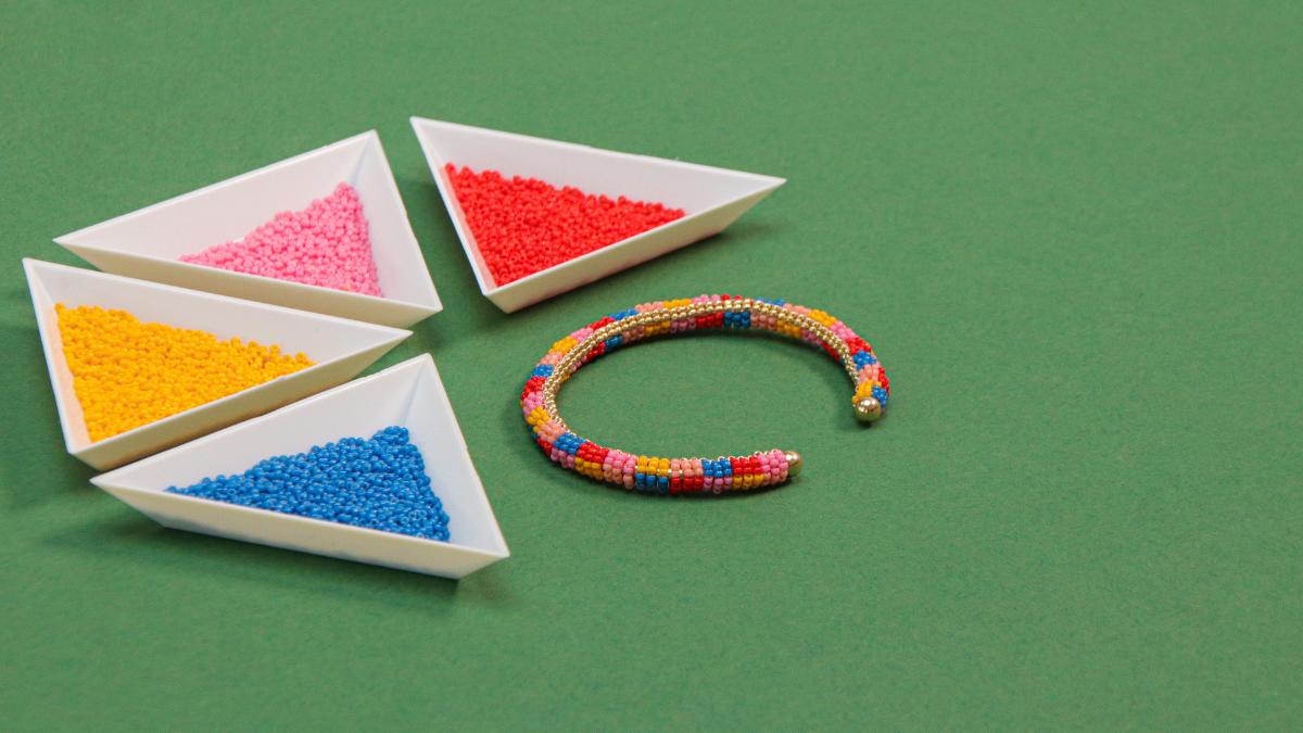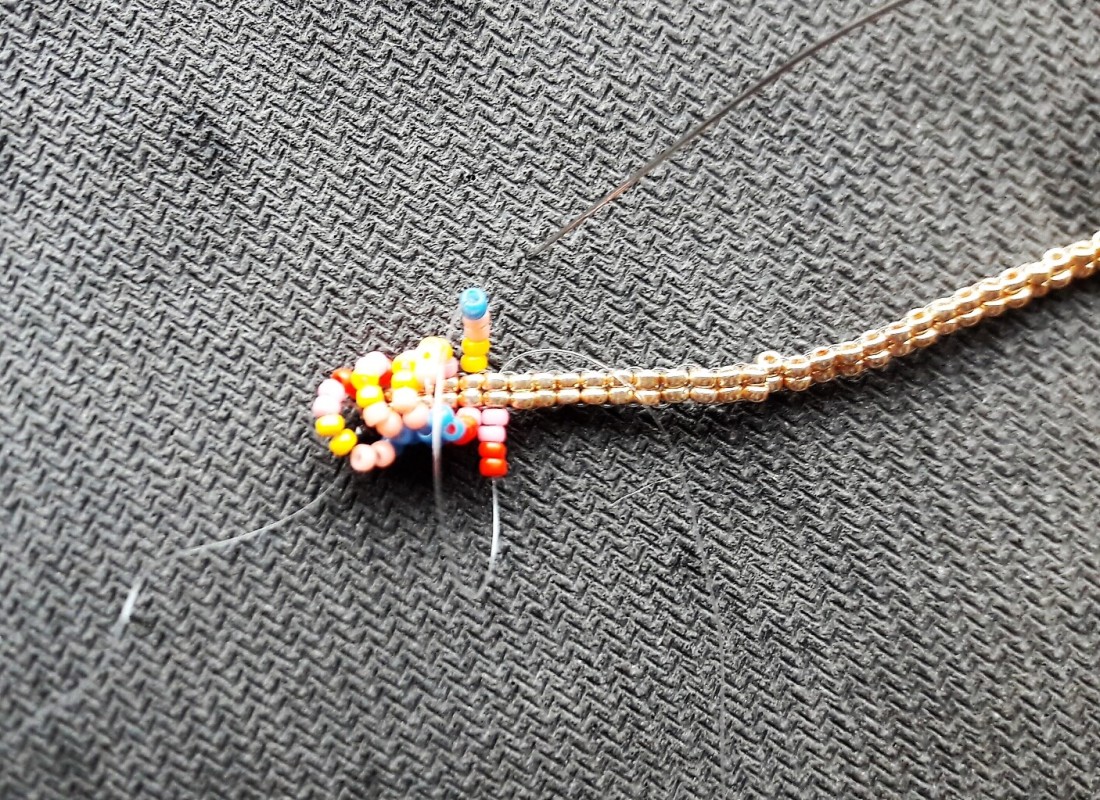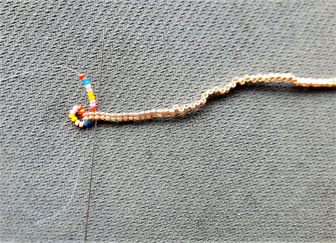 Finish the sleeve after making the last loop: to be on the safe side, run the thread up the band of golden pearls for a few rows. Then stop the thread by tying a surgeon's knot and passing the tail of the thread through the surrounding beads before cutting. Of course, both ends of the sleeve must remain open to allow the bangle to slide through.