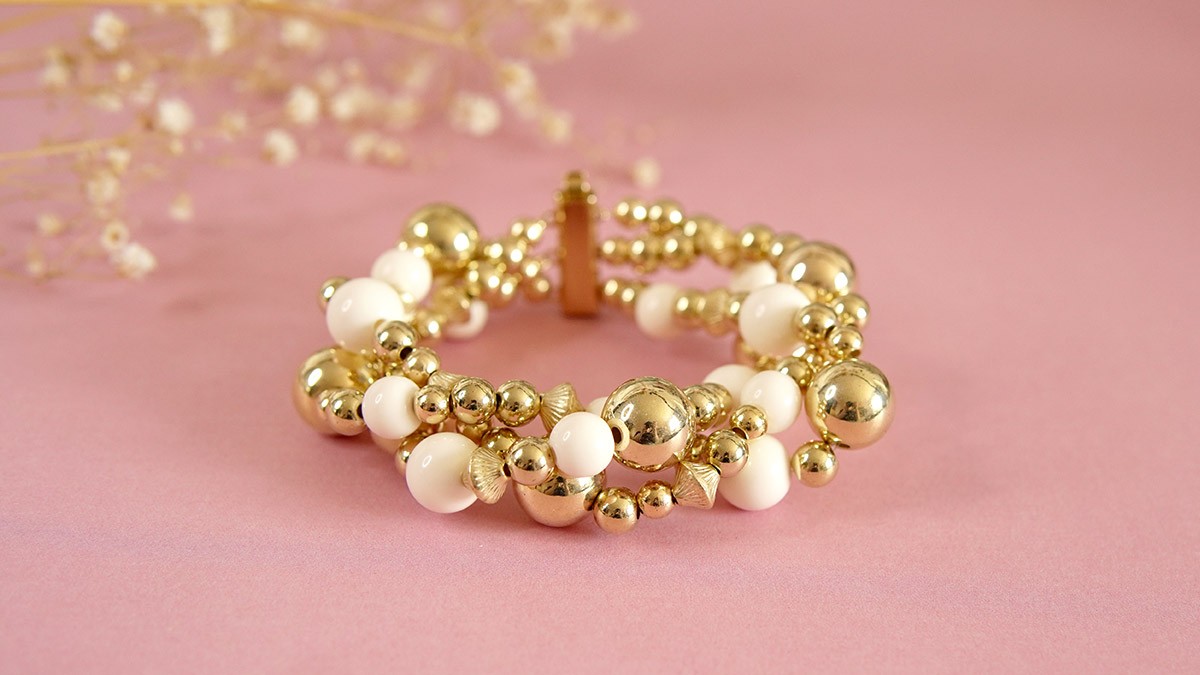 Create a chunky women's bracelet with our large, lightweight gold and cream beads. With this tutorial, you'll be able to create a bold, imposing cuff that's still elegant. Gold pearls mixed with cream pearls create a contrast that reinforces the luxurious feel, yet these pearls are very affordable. In fact, contrary to what you might think, they're made from CCB acrylic plastic. CCB stands for "Copper Coated beads". It's a technique that involves coating the beads with a layer of copper before plating them with another metallic color. So they have the lightness of plastic beads with the shine of metal beads. We also have pearl-effect ABS beads, which are very pretty and light. The multirang clasp is slim and elegant. It's a high-quality clasp, made in Germany. It lasts very well over time. The gold of the clasp is very similar to the gold of the pearls, so it blends in well with the bracelet.