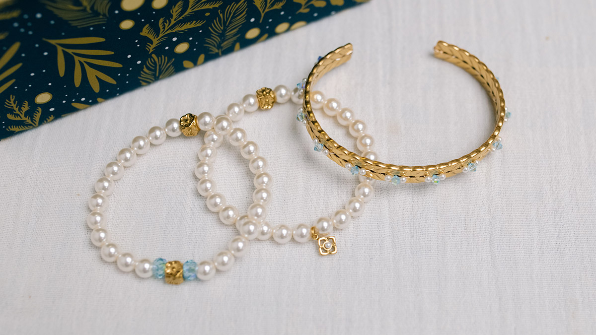 Pearly pearls are elegant, time-defying pearls. From genuine freshwater pearls to crystal pearls, they add a chic, feminine look to any outfit. Pearly pearl bracelets can be worn with a pretty satin or velvet dress for parties, or with jeans for a casual look. In this pearly jewelry tutorial, I'll show you how to make two elastic bracelets with Aurora 6 mm pearly beads and PureCrystal crystal beads. I'll also show you how to customize a gold-plated stainless steel band with small pearls. You can wear these three bracelets together or separately.