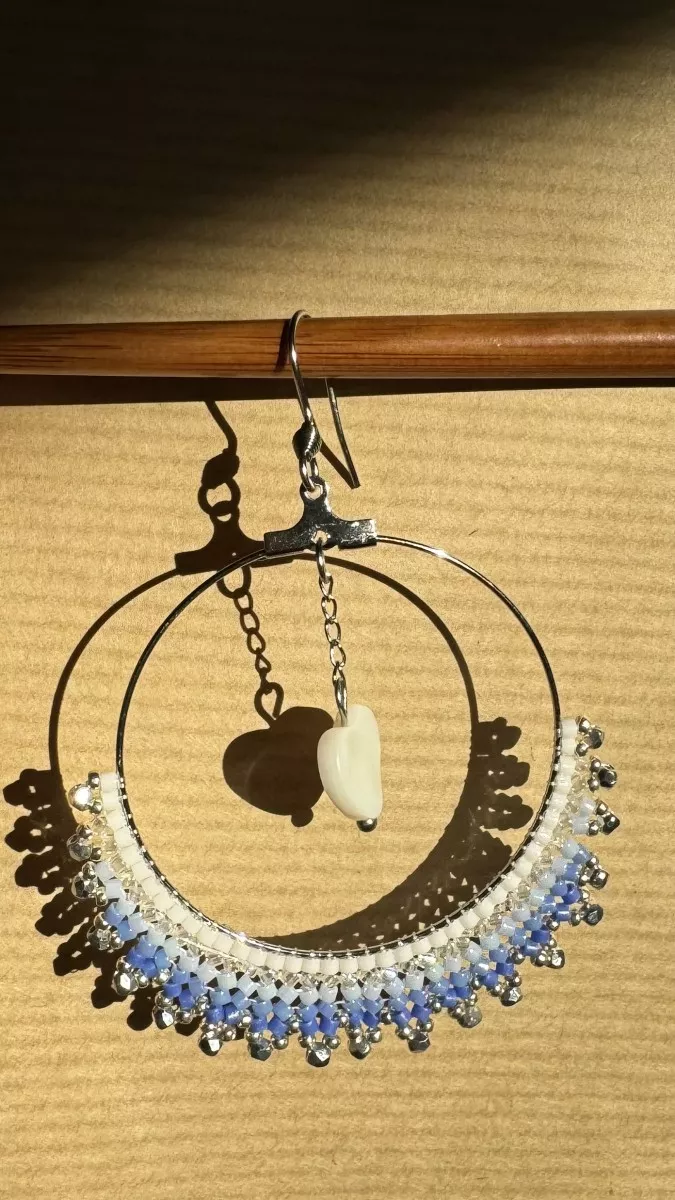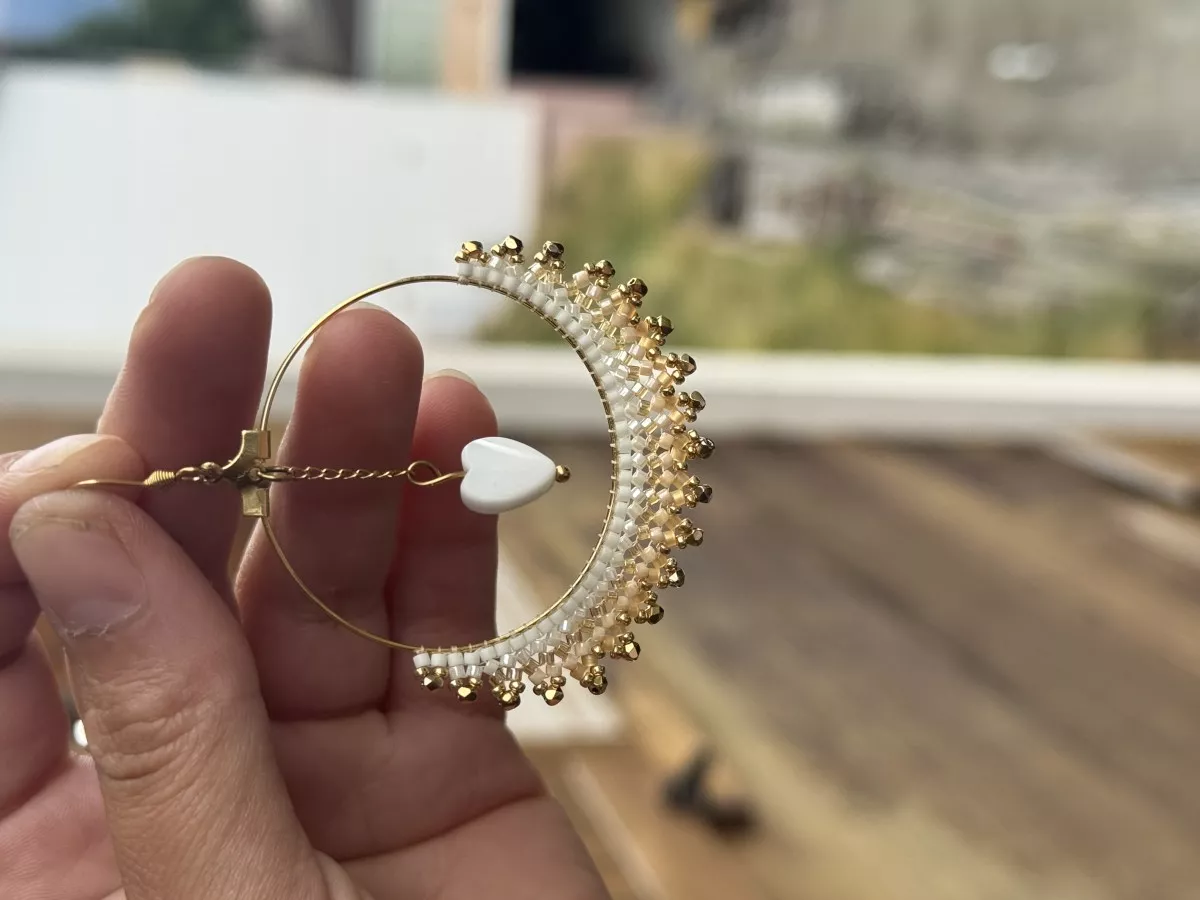 Straighten the wire end of the creole, on the back, with flat pliers to prevent the creole from opening during weaving. Cut approximately 1.5 m of 0.10 mm fireline thread and thread it onto a size 12 needle. Tie a double knot in the creole where you want to start weaving. Keep 20 cm of the thread end. To make your first row of brick stitch, thread two DB-0352 beads, then pass the needle under the creole to bring it out through the center. Then pass the needle back through the second bead. Tighten to place the beads perpendicular to the creole. Pass the needle through the first bead again, then through the second, and tighten to straighten both beads.