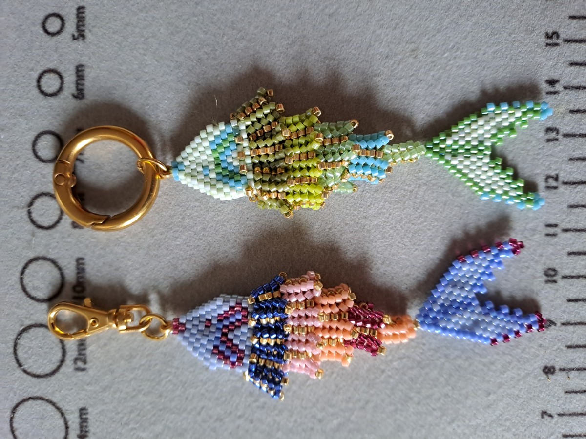 We've created this fish in seasonal colors to reflect the sea theme, but of course you're free to create and adapt your own color combinations. We have a wide choice of Delica beads on the site, so feel free to make your own selection. For the hook, we suggest a gold snap hook, but you can also choose a silver color, or opt for a chain if you'd like to wear it around your neck!