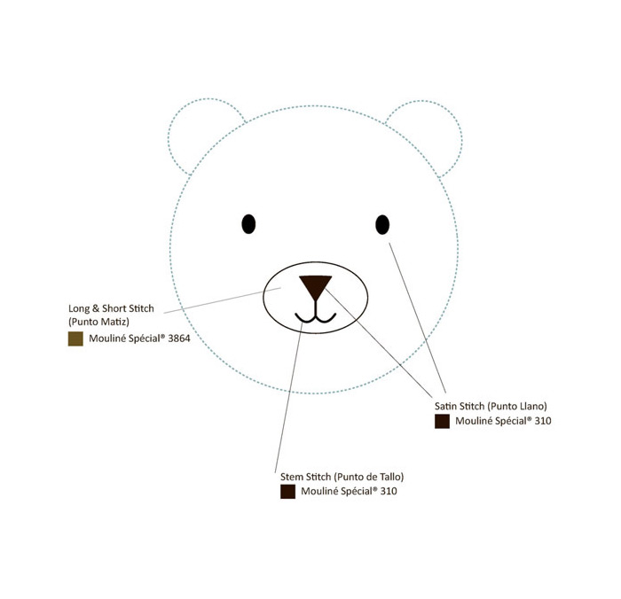 Embroider the eyes and nose in flat pastel stitch, the mouth in stem stitch and the outline of the mouth in encircling flat pastel stitch.