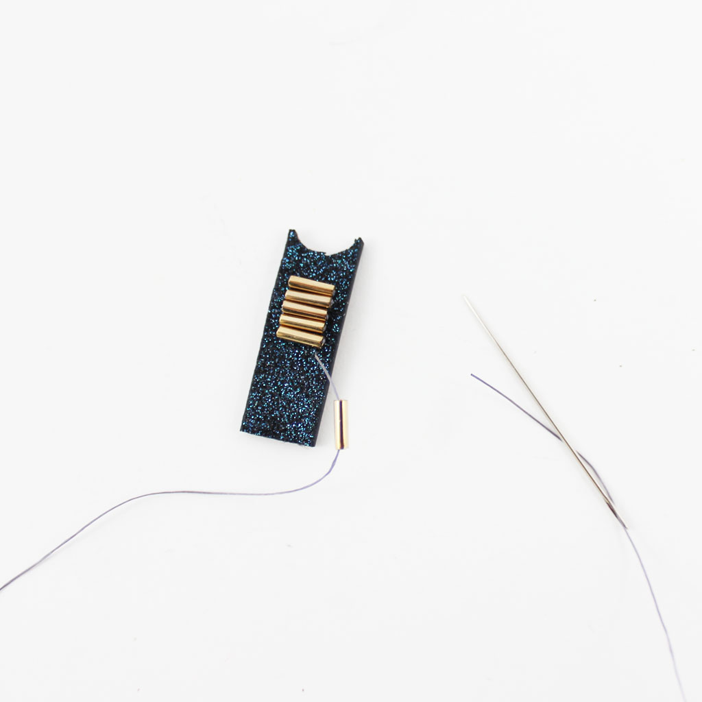 Sew Miyuki Bugles beads onto glittery ribbon. Use an embroidery needle and Miyuki thread.