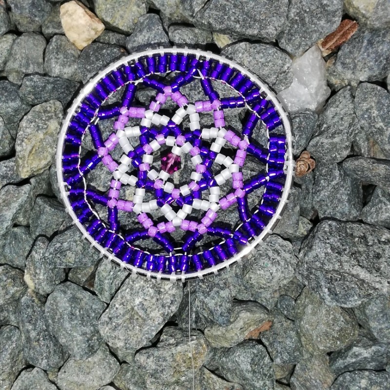 This weaving is achieved by tying a double knot, leaving about fifteen centimetres of free thread on the woven hoop.