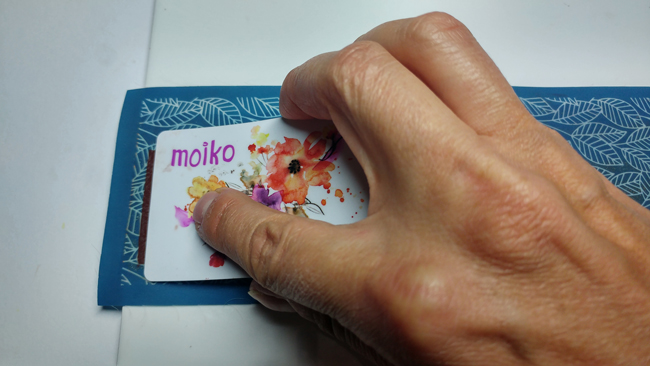 Check if the acrylic paint is completely dry on all printed surfaces. If so, you can now start cutting single sheets in the blue base of the bracelet and replacing them with the leaves cut out in the colored bases.