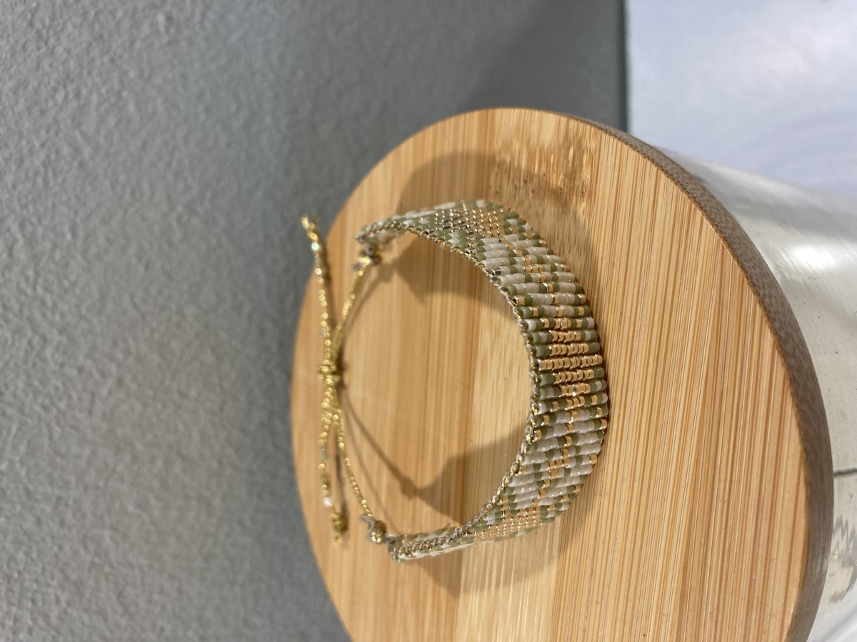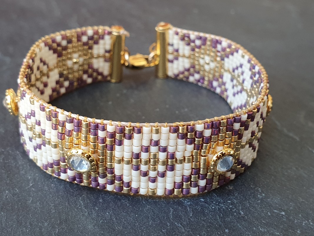 Untie it from the loom except for the first knot, you will now attach the rhinestones. On the first thread in the middle, thread the 3 or 4 rhinestones depending on the length of the bracelet you want. Surround the nail on the other side to attach the second thread. Pass again in the rhinestones and so on. You must pass 4 wires in the rhinestones. Be careful not to miss any of the rhinestones.